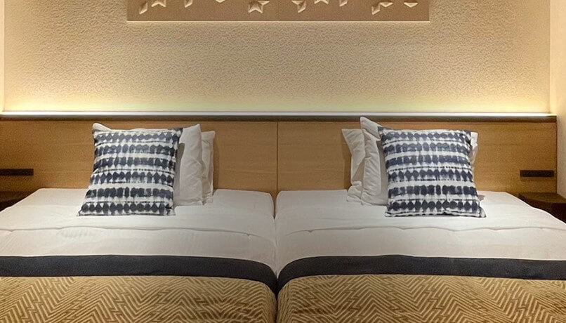 2022年新設のプレミアムツインルーム。 寝室は和室の上にシモンズ製のセミダブルベッドが2台、大人2名様用(添い寝幼児は2名まで可)の客室です。6畳相当のワーケーション兼ダイニングルームやミニキッチン、専用の露天風呂が付いており食材をお持ち込みいただいての長期滞在にもおすすめです。